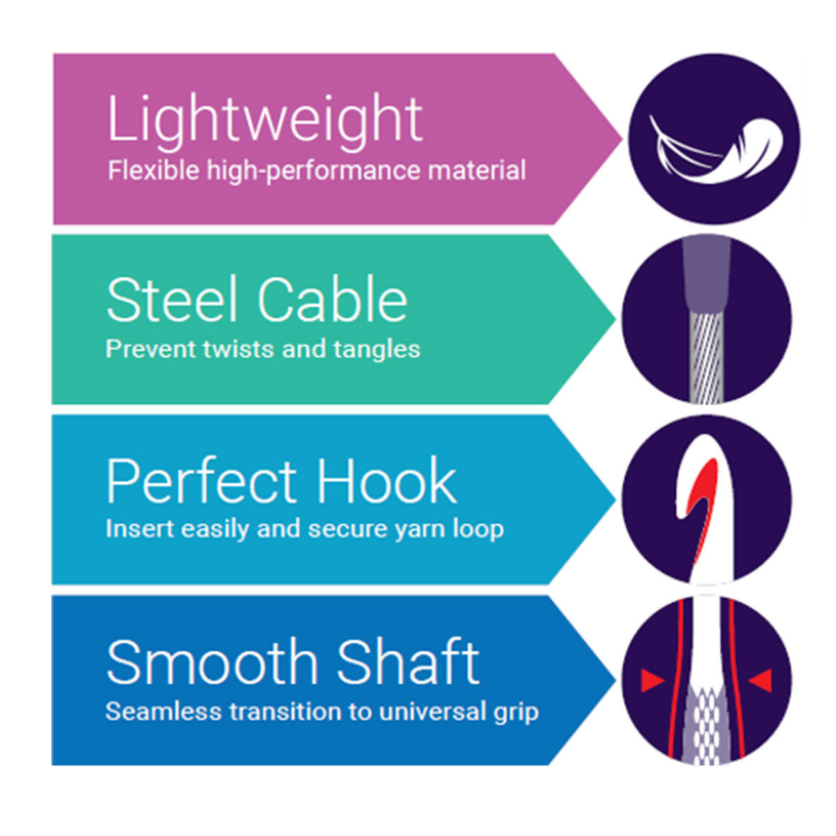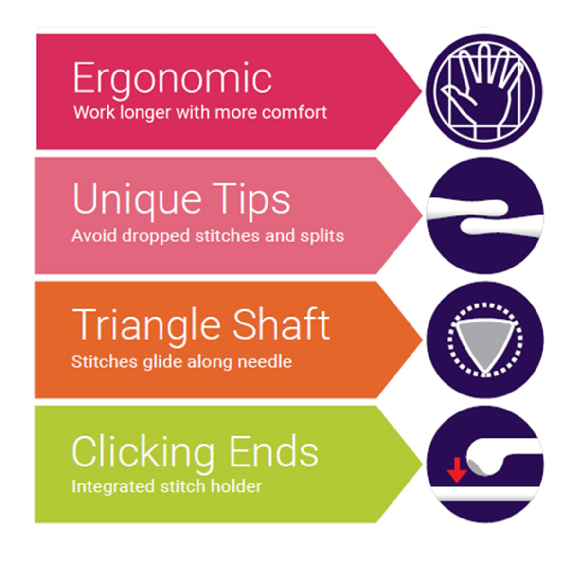 Avoid dropped stitches and split yarns with patented tear-drop shaped tips
